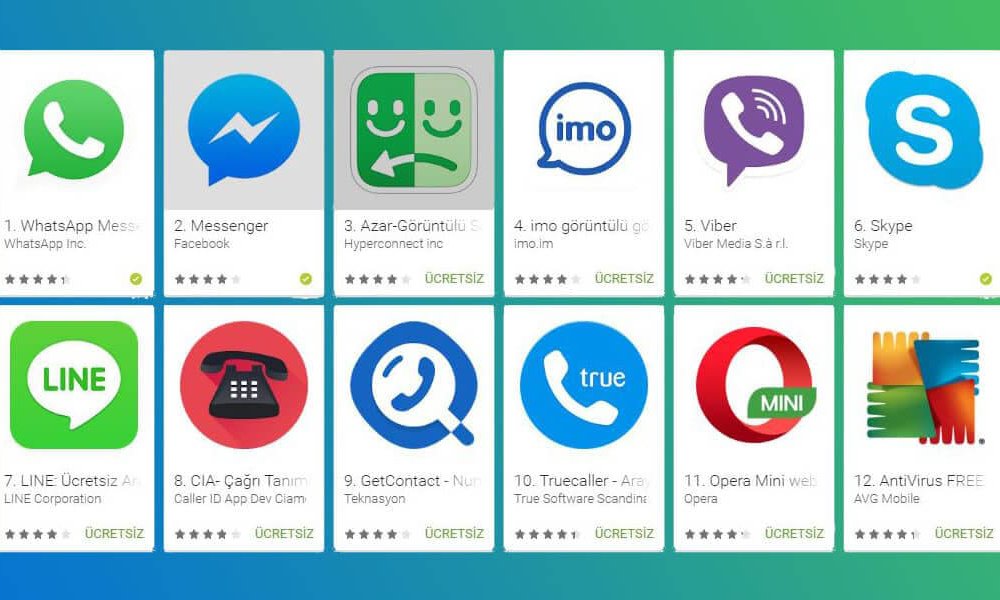 - imo : Imo sadece basit bir şekilde yazılı, sesli ve görüntülü sohbet üzerine odaklanmış mesajlaşma uygulamasıdır. Amacı tüm görüşmelerinizi en hızlı ve en iy kalitede yapmanızı sağlamaktır. Geçen sene listemize 21. sıradan giren imo uygulaması 9 sıra yükselerek 12 sıraya kadar çıktı. Bu da gün geçtikçe ne kadar çok tercih edilmeye başlandığını göstermektedir.