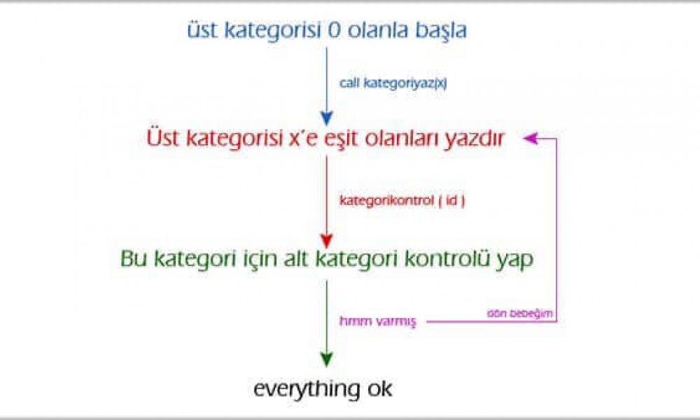 Aşağıdaki şemadan da anlaşılabileceği gibi sınırsız kategorilemenin işleyiş mantığı, önce üst kategorisi 0 olan tüm kategorileri yazdır, daha sonra bu kategorilerin her biri için alt kategori varmı kontrol et, eğer var ise o kategorileri yazdır ve tekrar bu yazdırdığım kategorilerin alt kategorisi var mı kontrol et eğer varsa yazdır.. Aslında bu şekilde kör bir döngüdür sınırsız kategorilemenin mantığı.