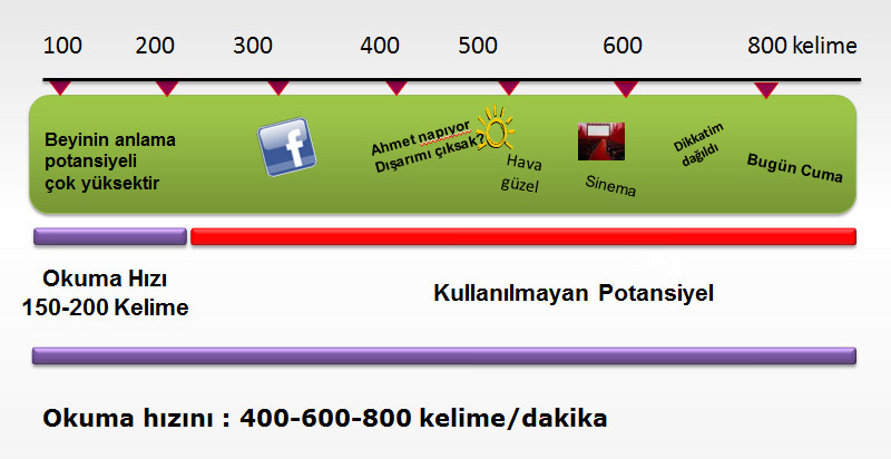 Beynimizin algılama hızı sanıldığında çok daha fazladır. Dakika da 800 kelimeyi algılayabilir ancak siz 150-200 kelime gönderdiğinizde beynin çok daha fazlasını işleyebilecek kapasitesi varken siz çok daha az kelime gönderdiğinizde mevcut kapasitesi boşluk kabul etmez ve bir şekilde onu başka konular ile doldurur. Hızlı okuma teknikleri bu anlamda beynin kelime işleme kapasitesine uyumlu bir biçimde kelimeleri göndererek daha iyi algılamasını sağlar.