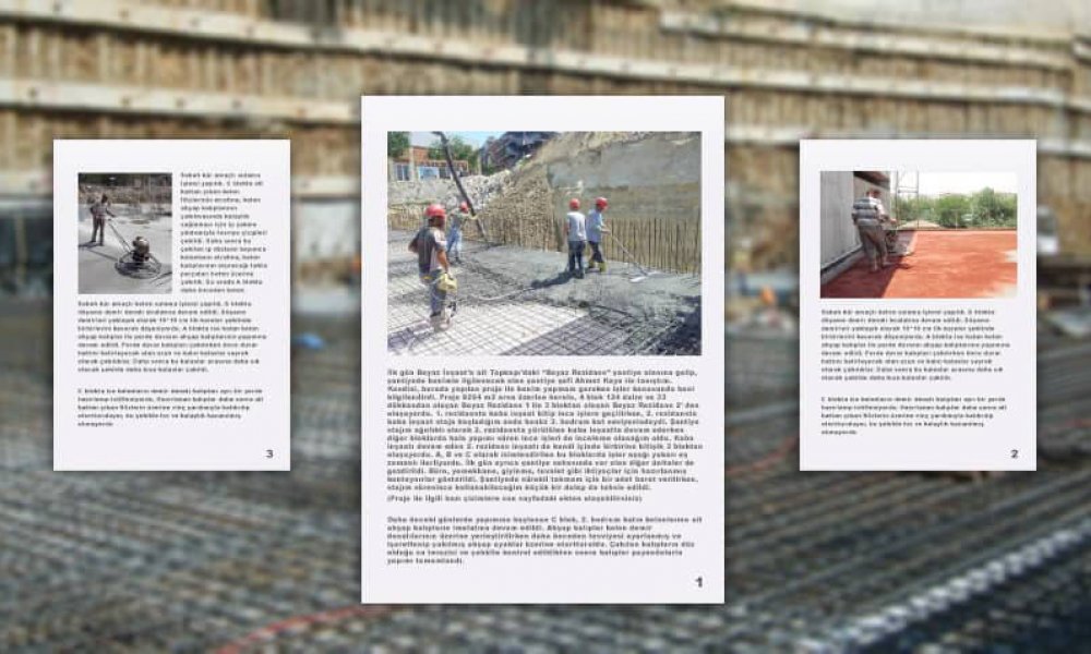 İlk gün Beyaz İnşaat’a ait Topkapı’daki “Beyaz Rezidans” şantiye alanına gelip, şantiyede benimle ilgilenecek olan şantiye şefi Ahmet Kaya ile tanıştım. Kendisi, burada yapılan proje ile benim yapmam gereken işler konusunda beni bilgilendirdi. Proje 9254 m2 arsa üzerine kurulu, 4 blok 124 daire ve 33 dükkandan oluşan Beyaz Rezidans 1 ile 3 bloktan oluşan Beyaz Rezidans 2’ den oluşuyordu. 1. rezidansta kaba inşaat bitip ince işlere geçilirken, 2. rezidansta kaba inşaat staja başladığım anda henüz 3. bodrum kat seviyesindeydi. Şantiye stajım ağırlıklı olarak 2. rezidansta yürütülen kaba inşaatta devam ederken diğer bloklarda hala yapımı süren ince işleri de inceleme olanağım oldu. Kaba inşaatı devam eden 2. rezidans inşaatı da kendi içinde birbirine bitişik 3 bloktan oluşuyordu. A, B ve C olarak isimlendirilen bu bloklarda işler aşağı yukarı eş zamanlı ilerliyordu. İlk gün ayrıca şantiye sahasında var olan diğer üniteler de gezdirildi. Büro, yemekhane, giyinme, tuvalet gibi ihtiyaçlar için hazırlanmış konteynırlar gösterildi. Şantiyede sürekli takmam için bir adet baret verilirken, stajım süresince kullanabileceğim küçük bir dolap da tahsis edildi.