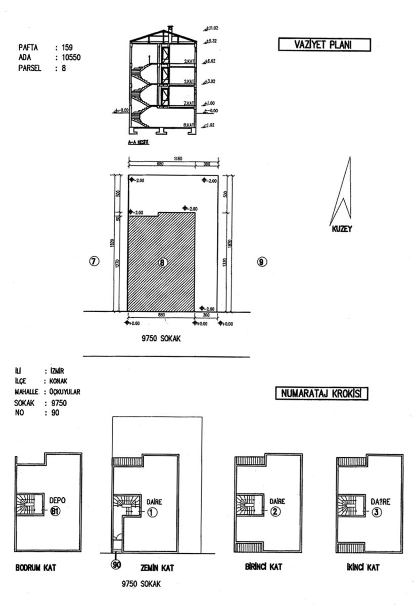 Numarataj krokisi: yapı katlarının bağımsız bölüm isimleri, kat no'ları ile sokak ve kapı numaralarını gösterir. Projelerde vazıyet planı ile numarataj krokisi bir arada bulunduğu için tapu kayıt bilgilerini ayni paftada görmek mümkündür.