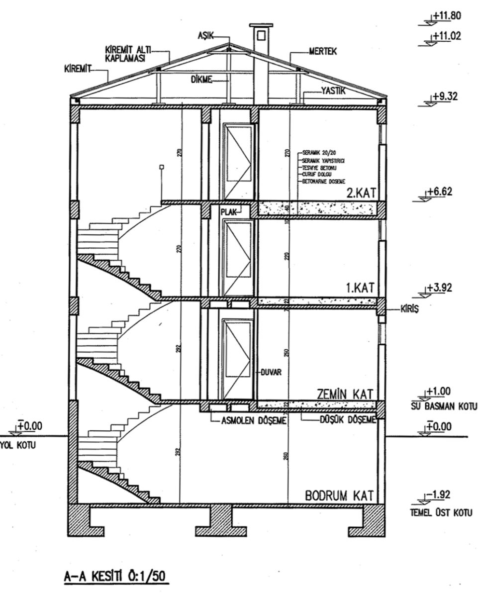 - Kesitten inşaatı yapılacak binanın; bodrum, zemin, ı. Kat, 2. Kat olmak üzere toplam 4 katlı olduğu görülmektedir.